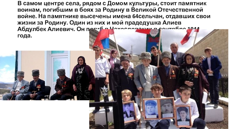 погибшим в боях за Родину в Великой Отечественной войне. На памятнике высечены имена 64сельчан, отдавших свои жизни за Родину. Один из них и мой прадедушка Алиев Абдулбек Алиевич. Он погиб в Чехословакии в сентябре 1944 года.
