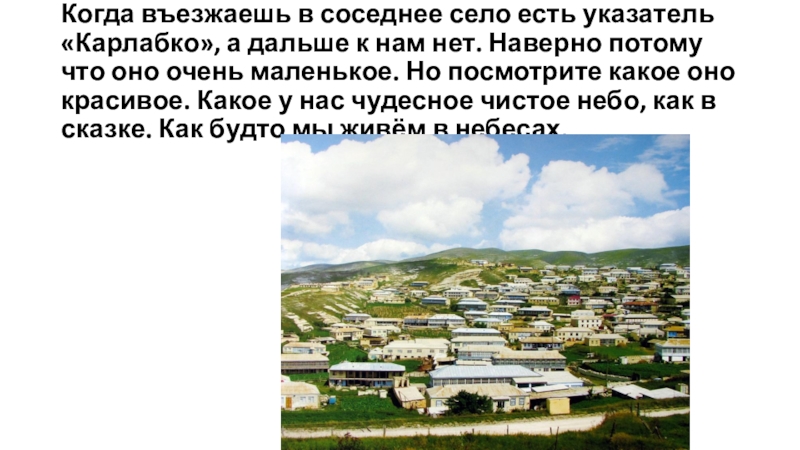 Слайд 3Когда въезжаешь в соседнее село есть указатель «Карлабко», а дальше к