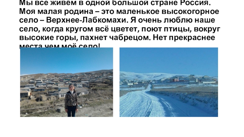 – это маленькое высокогорное село – Верхнее-Лабкомахи. Я очень люблю наше село, когда кругом всё цветет, поют птицы, вокруг высокие горы, пахнет чабрецом. Нет прекраснее места чем моё село!