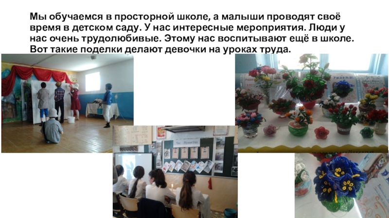 детском саду. У нас интересные мероприятия. Люди у нас очень трудолюбивые. Этому нас воспитывают ещё в школе. Вот такие поделки делают девочки на уроках труда.