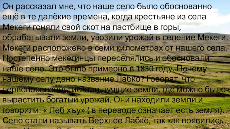 далёкие времена, когда крестьяне из села Мекеги гоняли свой скот на пастбище в горы, обрабатывали земли, увозили урожай в селение Мекеги. Мекеги расположено в семи километрах от нашего села. Постепенно мекегинцы переселялись и обосновали наше село. Это было примерно в 1830 году. Почему нашему селу дано название Лабко? Говорят, что первопоселенцы искали лучшие земли, где можно было вырастить богатый урожай. Они находили земли и говорили: « Леб хъу» ( в переводе означает есть земля). Село стали называть Верхнее Лабко, так как появились сёла Нижнее Лабко и Карлабко.