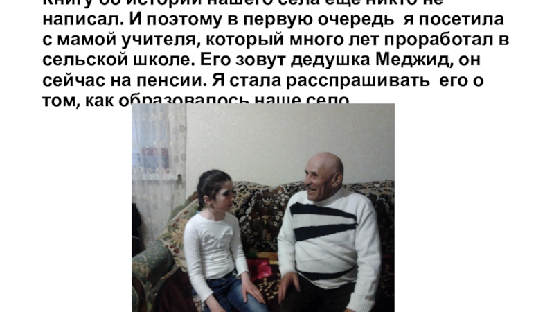 в первую очередь я посетила с мамой учителя, который много лет проработал в сельской школе. Его зовут дедушка Меджид, он сейчас на пенсии. Я стала расспрашивать его о том, как образовалось наше село.