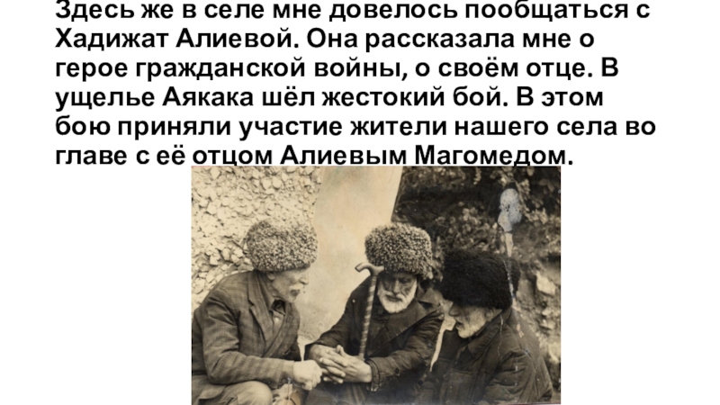рассказала мне о герое гражданской войны, о своём отце. В ущелье Аякака шёл жестокий бой. В этом бою приняли участие жители нашего села во главе с её отцом Алиевым Магомедом.