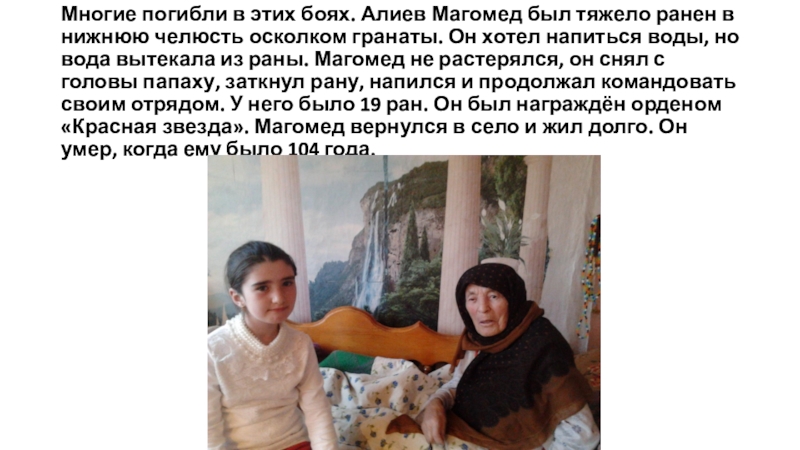 Слайд 12Многие погибли в этих боях. Алиев Магомед был тяжело ранен в