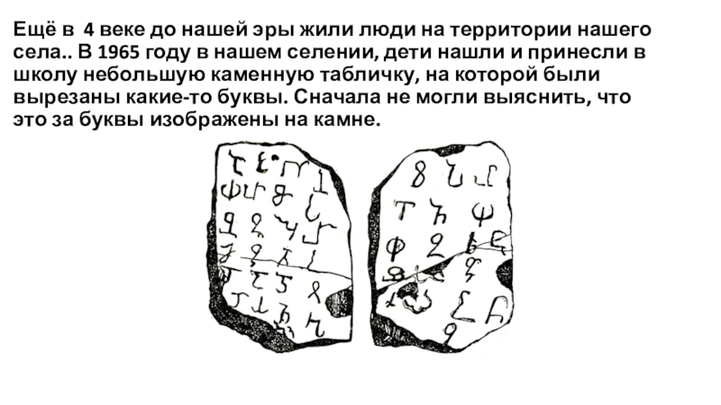 нашего села.. В 1965 году в нашем селении, дети нашли и принесли в школу небольшую каменную табличку, на которой были вырезаны какие-то буквы. Сначала не могли выяснить, что это за буквы изображены на камне.