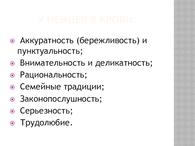 У немцев в крови: Аккуратность (бережливость) и пунктуальность; Внимательность и деликатность; Рациональность; Семейные традиции; Законопослушность; Серьезность; Трудолюбие.
