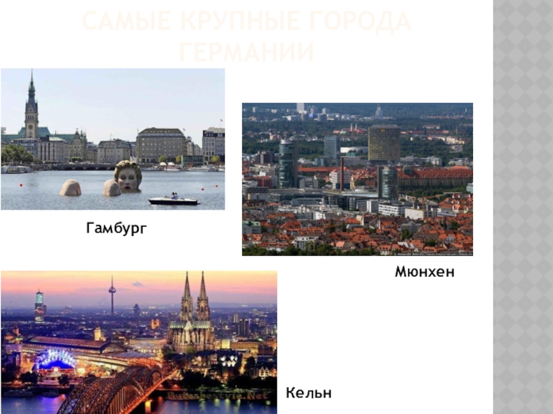 Германия – официальное название - Федеративная Республика Германия, государство в Центральной Европе. Германия происходит от латинского названия «Германиа», а само слово произошло от кельтского «сосед». Территория Германии составляет 357.000 кв.км. С нею граничат девять государств: Дания на
