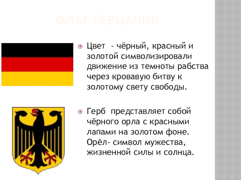 Флаг ГерманииЦвет - чёрный, красный и золотой символизировали движение из темноты рабства через кровавую битву к золотому