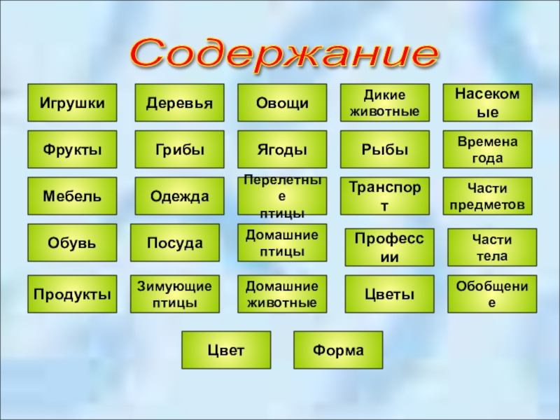Содержание ИгрушкиДеревьяОвощиЯгодыЗимующие птицыПосудаОдеждаГрибыПродуктыОбувьМебельФруктыПерелетные птицыДомашние птицыДомашние животныеДикие животныеРыбыТранспортПрофессииЦветыНасекомыеВремена годаЧасти предметовЧасти телаОбобщениеЦветФорма