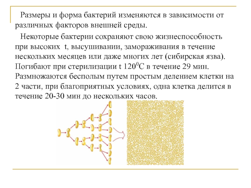 Некоторые бактерии сохраняют свою жизнеспособность при высоких t, высушивании, замораживания в течение нескольких месяцев или даже многих лет (сибирская язва). Погибают при стерилизации t 1200C в течение 29 мин. Размножаются бесполым путем простым делением клетки на 2 части, при благоприятных условиях, одна клетка делится в течение 20-30 мин до нескольких часов.