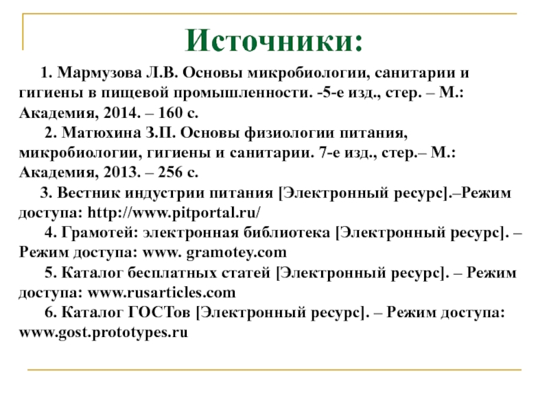 1. Мармузова Л.В. Основы микробиологии, санитарии и гигиены в пищевой промышленности.