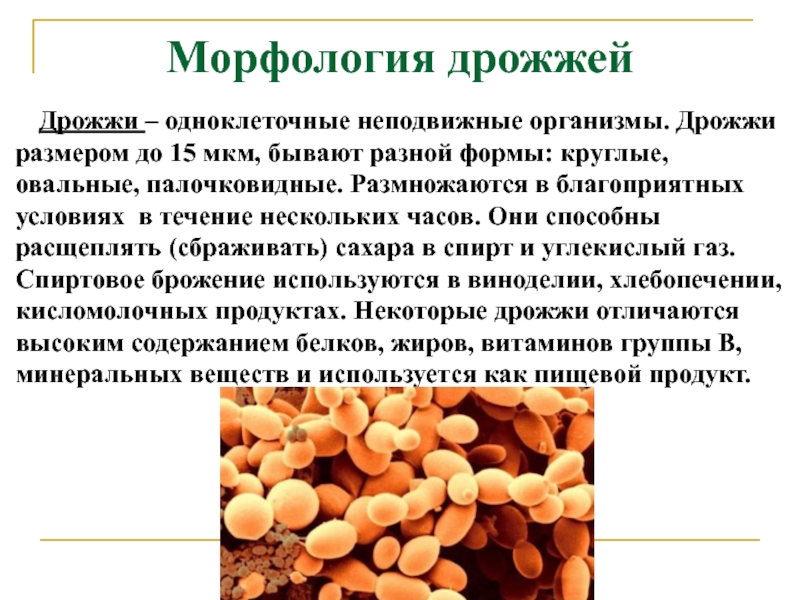 бывают разной формы: круглые, овальные, палочковидные. Размножаются в благоприятных условиях в течение нескольких часов. Они способны расщеплять (сбраживать) сахара в спирт и углекислый газ. Спиртовое брожение используются в виноделии, хлебопечении, кисломолочных продуктах. Некоторые дрожжи отличаются высоким содержанием белков, жиров, витаминов группы В, минеральных веществ и используется как пищевой продукт.