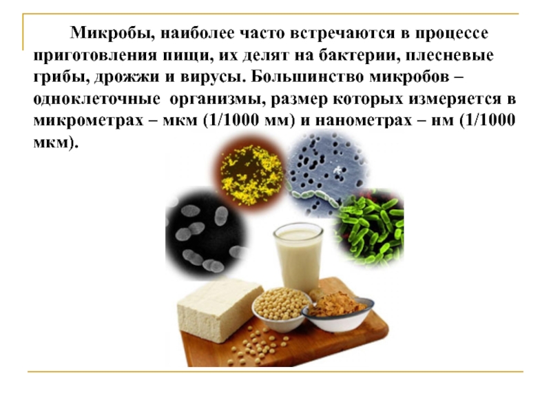 пищи, их делят на бактерии, плесневые грибы, дрожжи и вирусы. Большинство микробов – одноклеточные организмы, размер которых измеряется в микрометрах – мкм (1/1000 мм) и нанометрах – нм (1/1000 мкм).