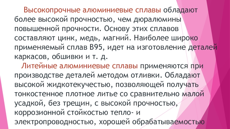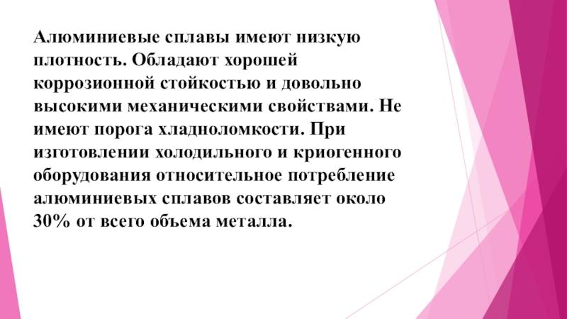 Слайд 7Алюминиевые сплавы имеют низкую плотность. Обладают хорошей коррозионной стойкостью и довольно
