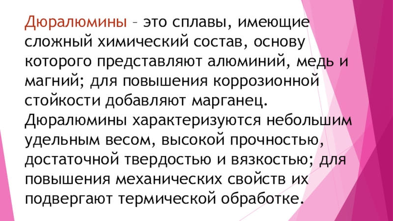Слайд 11Дюралюмины – это сплавы, имеющие сложный химический состав, основу которого представляют