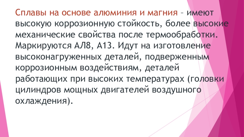 Слайд 18Сплавы на основе алюминия и магния – имеют высокую коррозионную стойкость,