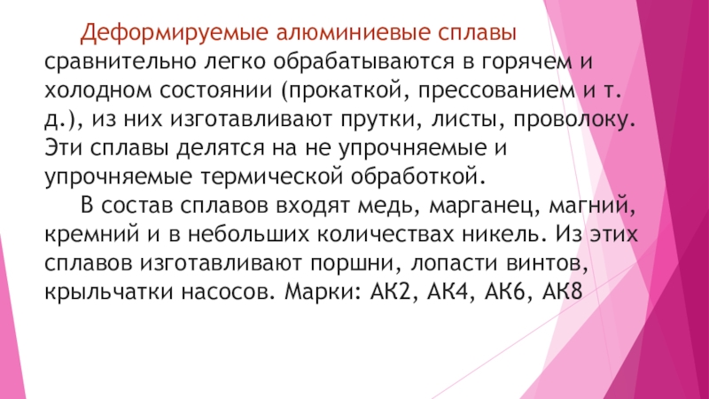 и холодном состоянии (прокаткой, прессованием и т.д.), из них изготавливают прутки, листы, проволоку. Эти сплавы делятся на не упрочняемые и упрочняемые термической обработкой.