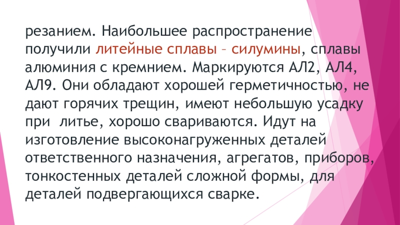 Слайд 17резанием. Наибольшее распространение получили литейные сплавы – силумины, сплавы алюминия с