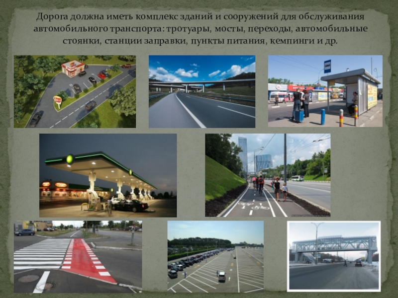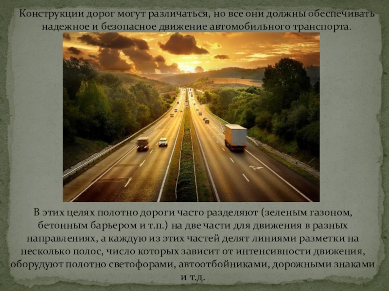 В этих целях полотно дороги часто разделяют (зеленым газоном, бетонным барьером и т.п.) на две части для движения в разных направлениях, а каждую из этих частей делят линиями разметки на несколько полос, число которых зависит от интенсивности движения, оборудуют полотно светофорами, автоотбойниками, дорожными знаками и т.д.