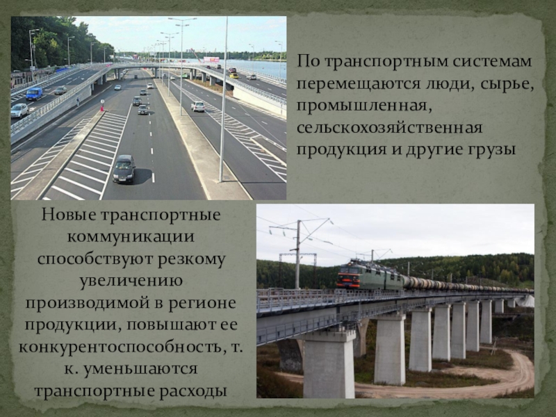 По транспортным системам перемещаются люди, сырье, промышленная, сельскохозяйственная продукция и другие грузы