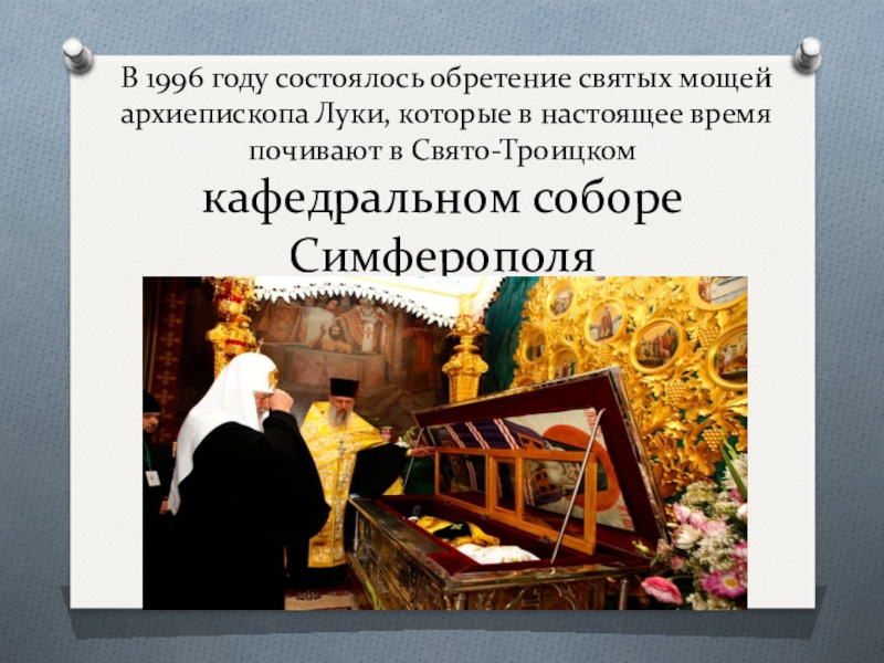 Слайд 14В 1996 году состоялось обретение святых мощей архиепископа Луки, которые в