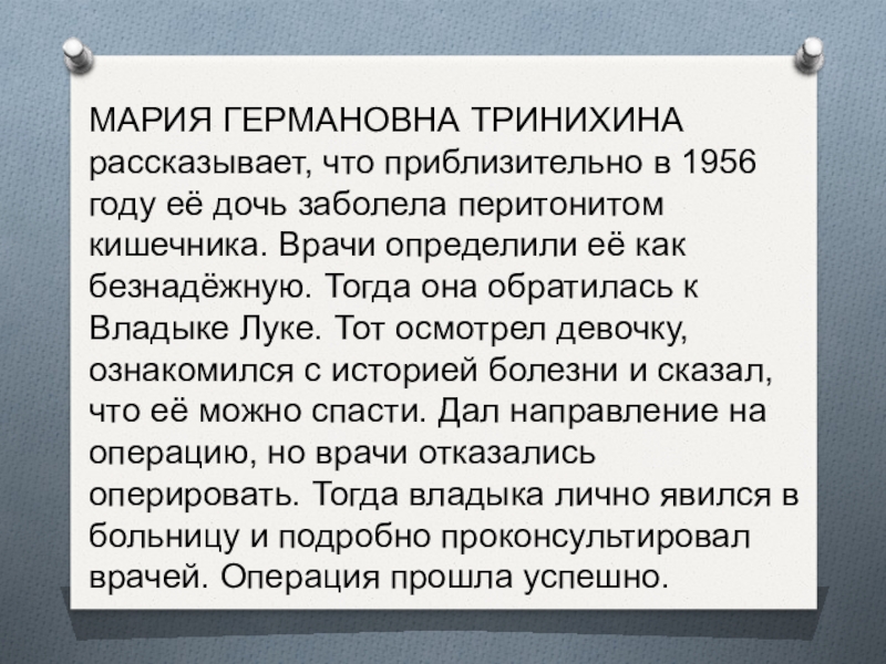 Слайд 19МАРИЯ ГЕРМАНОВНА ТРИНИХИНА рассказывает, что приблизительно в 1956 году её дочь