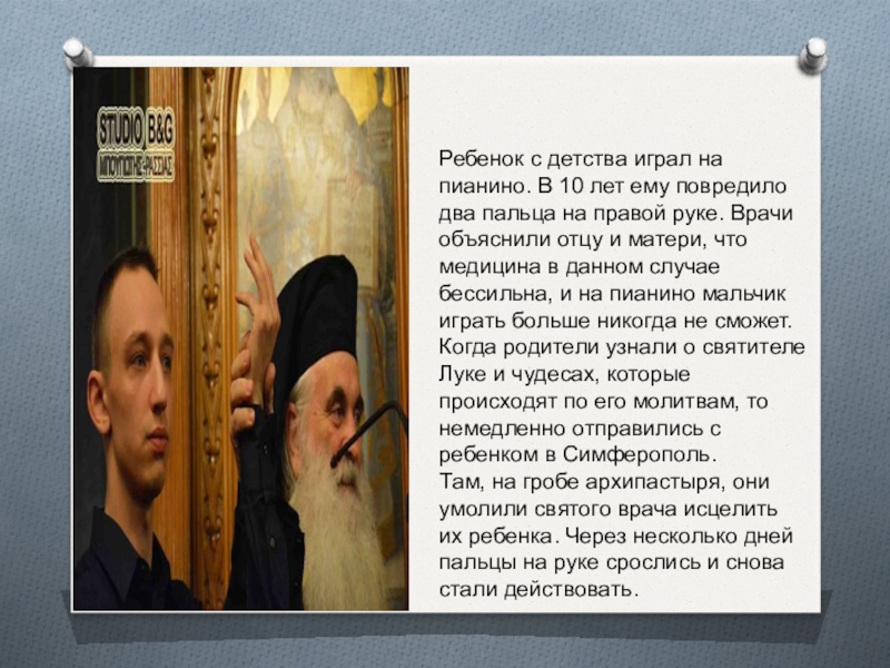 два пальца на правой руке. Врачи объяснили отцу и матери, что медицина в данном случае бессильна, и на пианино мальчик играть больше никогда не сможет. Когда родители узнали о святителе Луке и чудесах, которые происходят по его молитвам, то немедленно отправились с ребенком в Симферополь.