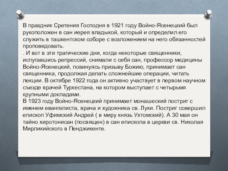 Слайд 7В праздник Сретения Господня в 1921 году Войно-Ясенецкий был рукоположен в