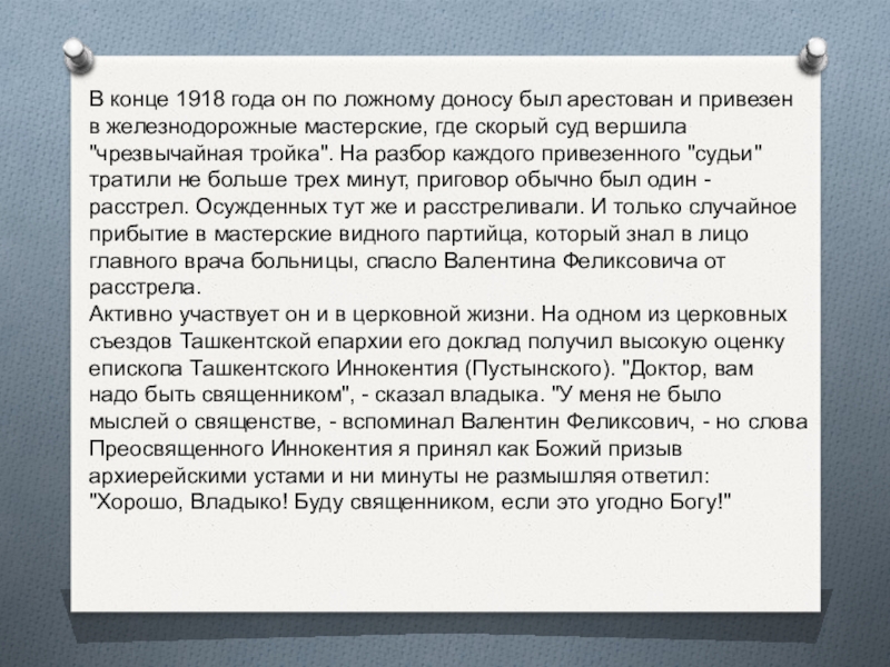 Активно участвует он и в церковной жизни. На одном из церковных съездов Ташкентской епархии его доклад получил высокую оценку епископа Ташкентского Иннокентия (Пустынского). "Доктор, вам надо быть священником", - сказал владыка. "У меня не было мыслей о священстве, - вспоминал Валентин Феликсович, - но слова Преосвященного Иннокентия я принял как Божий призыв архиерейскими устами и ни минуты не размышляя ответил: "Хорошо, Владыко! Буду священником, если это угодно Богу!"