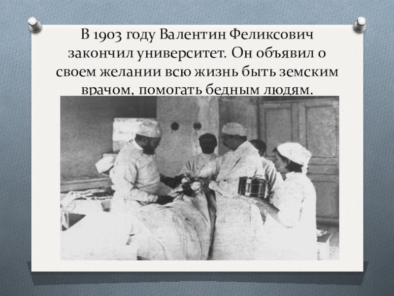 Слайд 3В 1903 году Валентин Феликсович закончил университет. Он объявил о своем