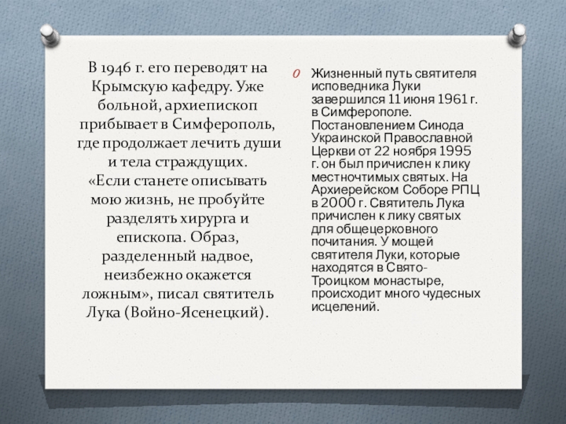 «Если станете описывать мою жизнь, не пробуйте разделять хирурга и епископа. Образ, разделенный надвое, неизбежно окажется ложным», писал святитель Лука (Войно-Ясенецкий).