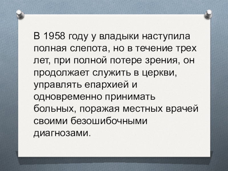 Слайд 9В 1958 году у владыки наступила полная слепота, но в течение