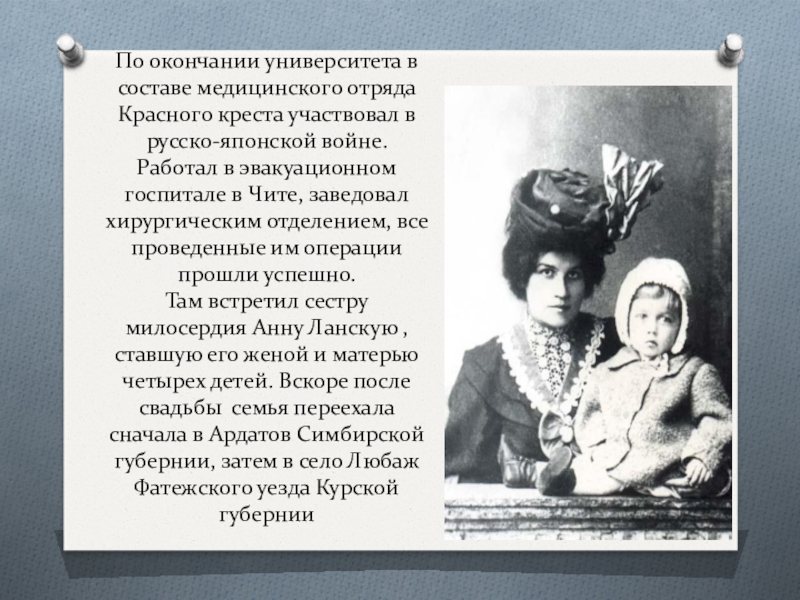 Там встретил сестру милосердия Анну Ланскую , ставшую его женой и матерью четырех детей. Вскоре после свадьбы семья переехала сначала в Ардатов Симбирской губернии, затем в село Любаж Фатежского уезда Курской губернии