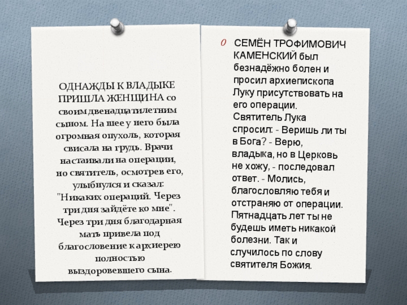 СЕМЁН ТРОФИМОВИЧ КАМЕНСКИЙ был безнадёжно болен и просил архиепископа Луку присутствовать на его операции. Святитель Лука спросил: - Веришь ли ты в Бога? - Верю, владыка, но в Церковь не хожу, - последовал ответ. - Молись, благословляю тебя и отстраняю от операции. Пятнадцать лет ты не будешь иметь никакой болезни. Так и случилось по слову святителя Божия.