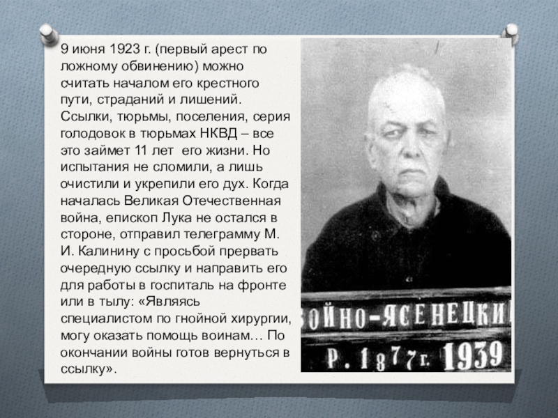 началом его крестного пути, страданий и лишений. Ссылки, тюрьмы, поселения, серия голодовок в тюрьмах НКВД – все это займет 11 лет его жизни. Но испытания не сломили, а лишь очистили и укрепили его дух. Когда началась Великая Отечественная война, епископ Лука не остался в стороне, отправил телеграмму М.И. Калинину с просьбой прервать очередную ссылку и направить его для работы в госпиталь на фронте или в тылу: «Являясь специалистом по гнойной хирургии, могу оказать помощь воинам… По окончании войны готов вернуться в ссылку».