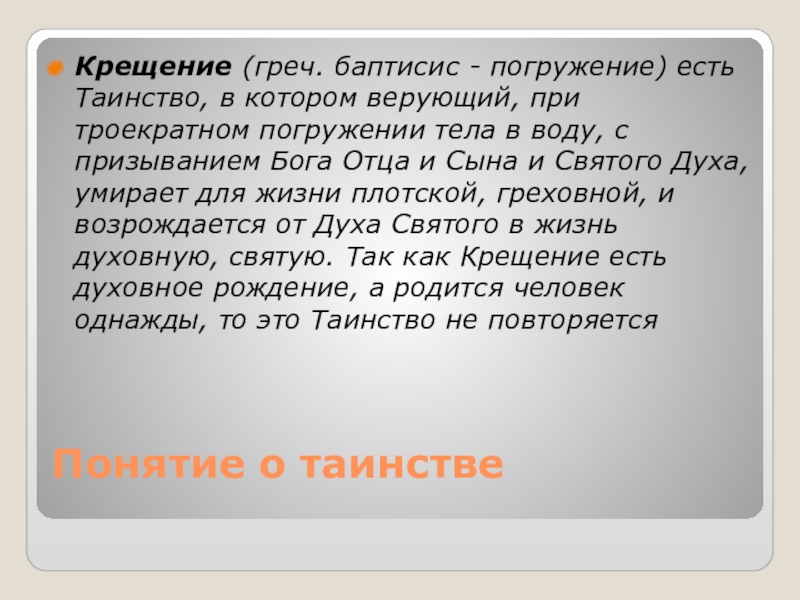 Понятие о таинствеКрещение (греч. баптисис - погружение) есть Таинство, в котором верующий, при троекратном погружении тела в воду, с