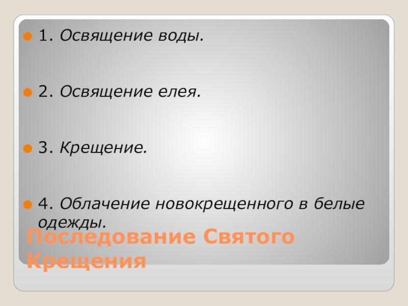 Последование Святого Крещения1. Освящение воды.2. Освящение елея.3. Крещение.4. Облачение новокрещенного в белые одежды.
