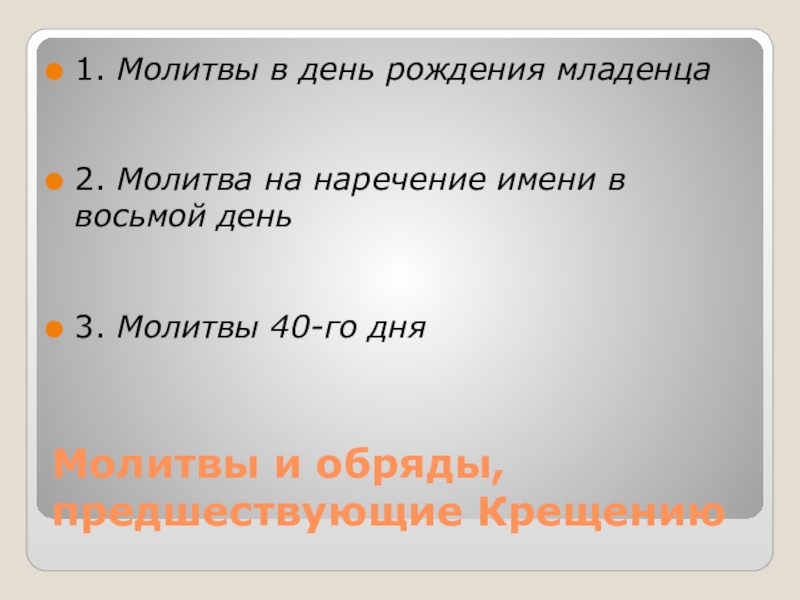 Молитвы и обряды, предшествующие Крещению1. Молитвы в день рождения младенца2. Молитва на наречение имени в восьмой день3. Молитвы 40-го дня