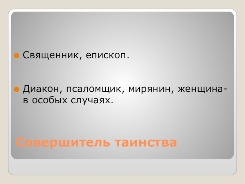 Совершитель таинстваСвященник, епископ.Диакон, псаломщик, мирянин, женщина- в особых случаях.
