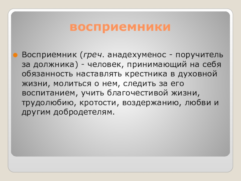 восприемникиВосприемник (греч. анадехуменос - поручитель за должника) - человек, принимающий на себя обязанность наставлять крестника в духовной