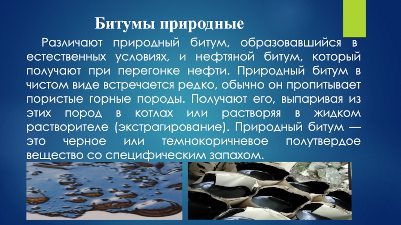 нефтяной битум, который получают при перегонке нефти. Природный битум в чистом виде встречается редко, обычно он пропитывает пористые горные породы. Получают его, выпаривая из этих пород в котлах или растворяя в жидком растворителе (экстрагирование). Природный битум —это черное или темнокоричневое полутвердое вещество со специфическим запахом.