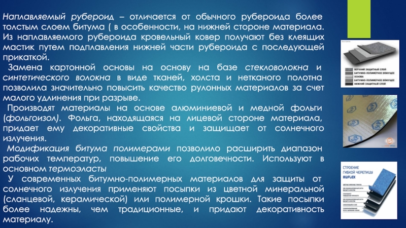Слайд 12Наплавляемый рубероид – отличается от обычного рубероида более толстым слоем битума