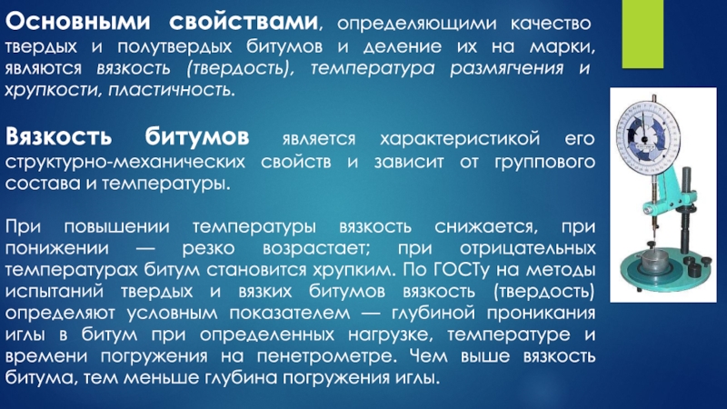 При повышении температуры вязкость снижается, при понижении — резко возрастает; при отрицательных температурах битум становится хрупким. По ГОСТу на методы испытаний твердых и вязких битумов вязкость (твердость) определяют условным показателем — глубиной проникания иглы в битум при определенных нагрузке, температуре и времени погружения на пенетрометре. Чем выше вязкость битума, тем меньше глубина погружения иглы.