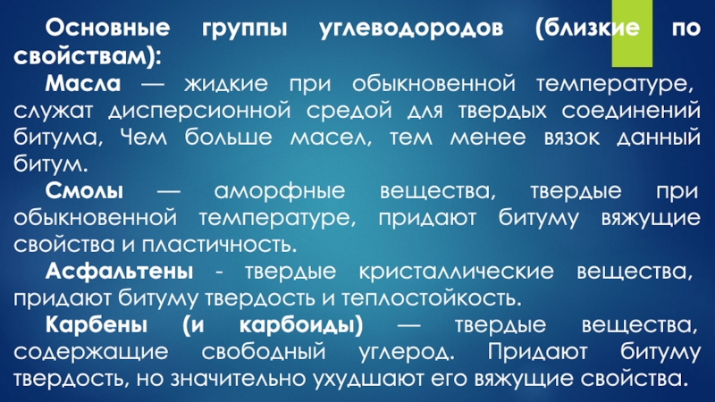 Карбены (и карбоиды) — твердые вещества, содержащие свободный углерод. Придают битуму твердость, но значительно ухудшают его вяжущие свойства.