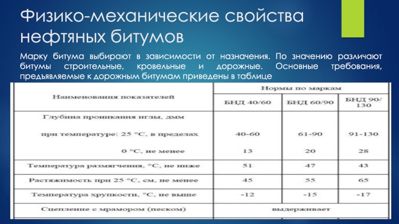 Слайд 10Основными свойствами, определяющими качество твердых и полутвердых битумов и деление их