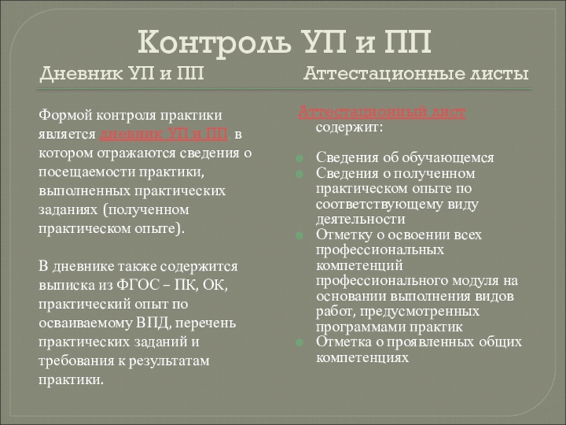 Формой контроля практики является дневник УП и ПП, в котором отражаются сведения о посещаемости практики, выполненных практических заданиях (полученном практическом опыте).