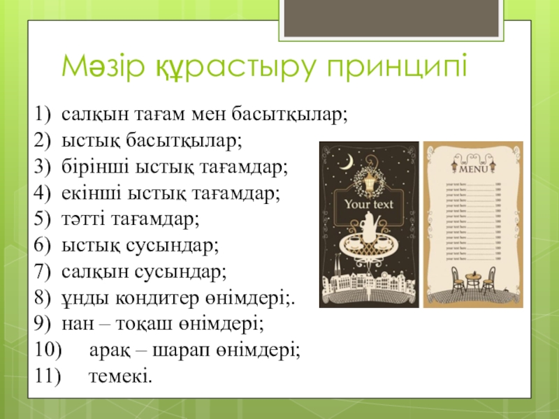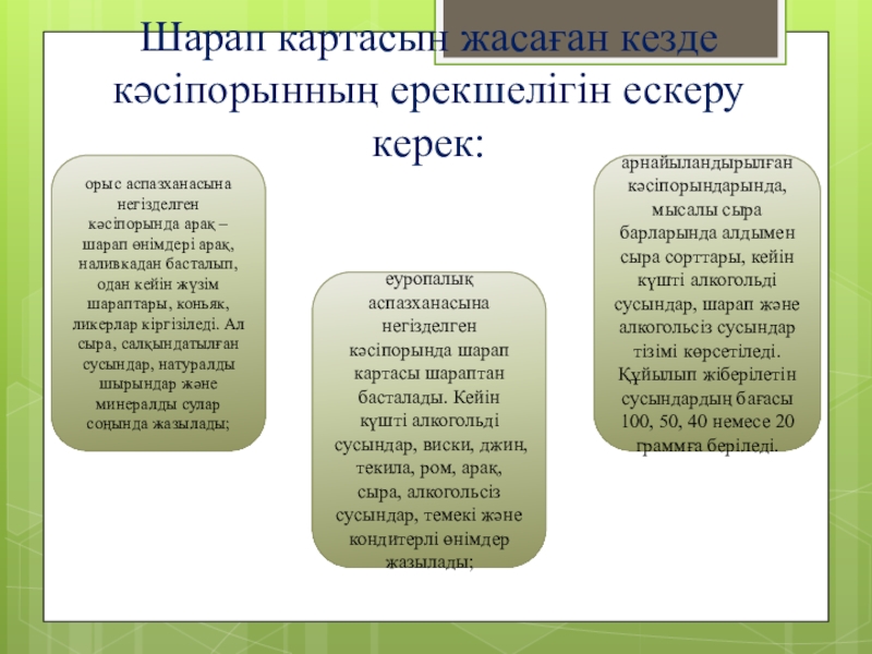 арнайыландырылған кәсіпорындарында, мысалы сыра барларында алдымен сыра сорттары, кейін күшті алкогольді сусындар, шарап және алкогольсіз сусындар тізімі көрсетіледі. Құйылып жіберілетін сусындардың бағасы 100, 50, 40 немесе 20 граммға беріледі.