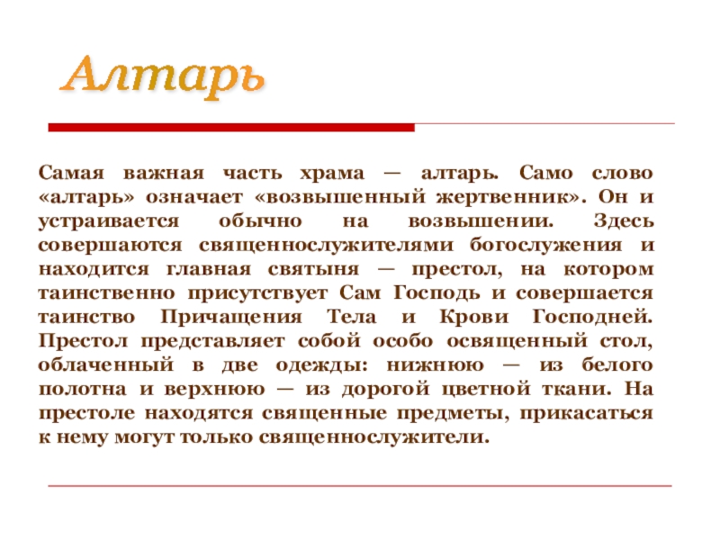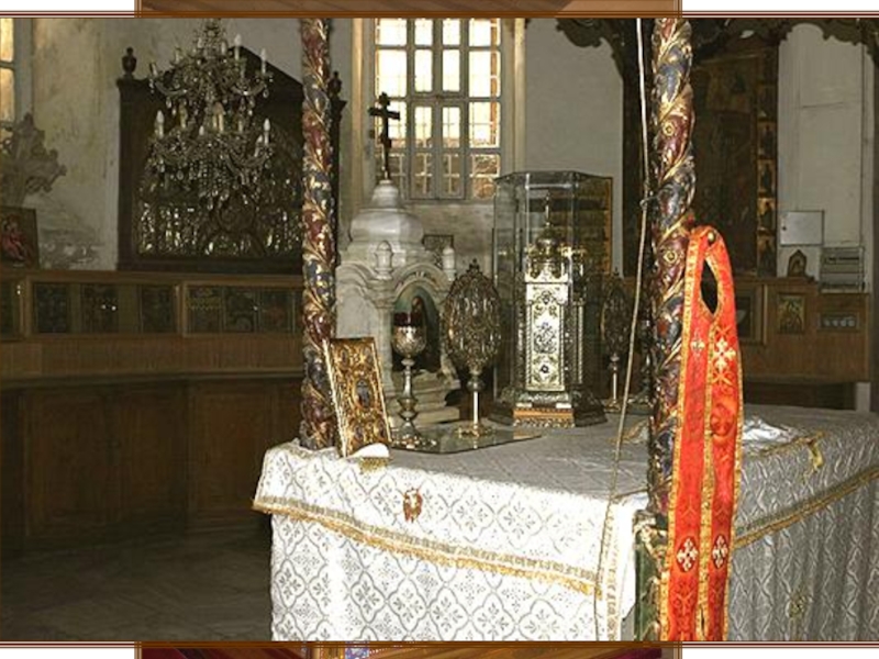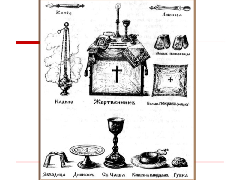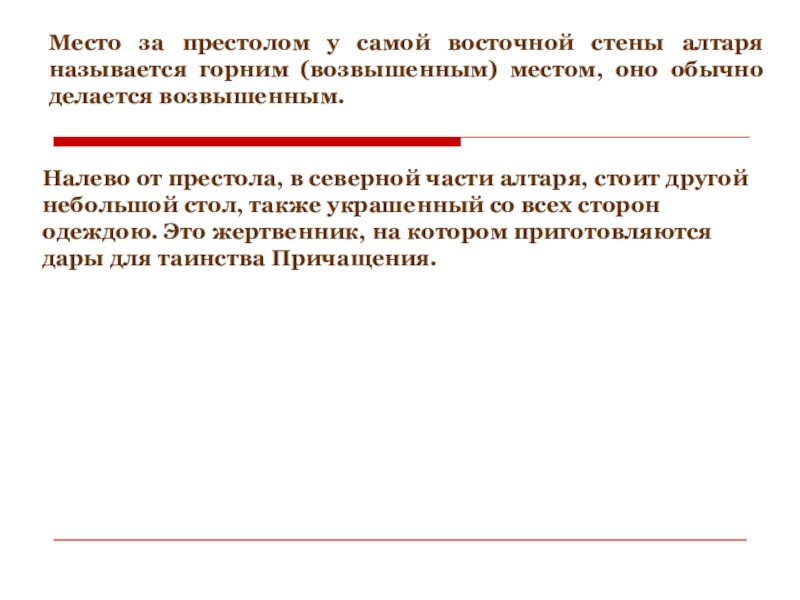 Налево от престола, в северной части алтаря, стоит другой небольшой стол, также украшенный со всех сторон одеждою. Это жертвенник, на котором приготовляются дары для таинства Причащения.