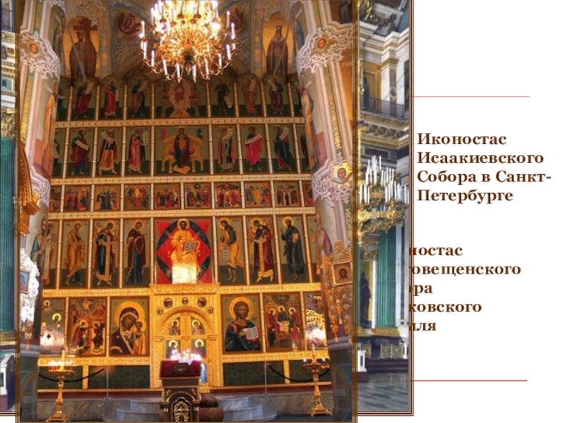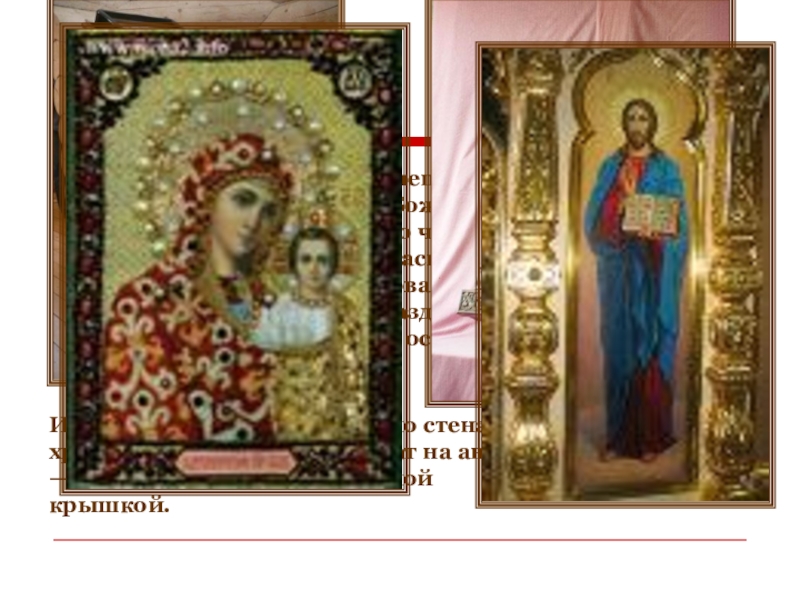 Иконы также размещаются по стенам храма в рамах — киотах, лежат на аналоях — особых столиках с наклонной крышкой.
