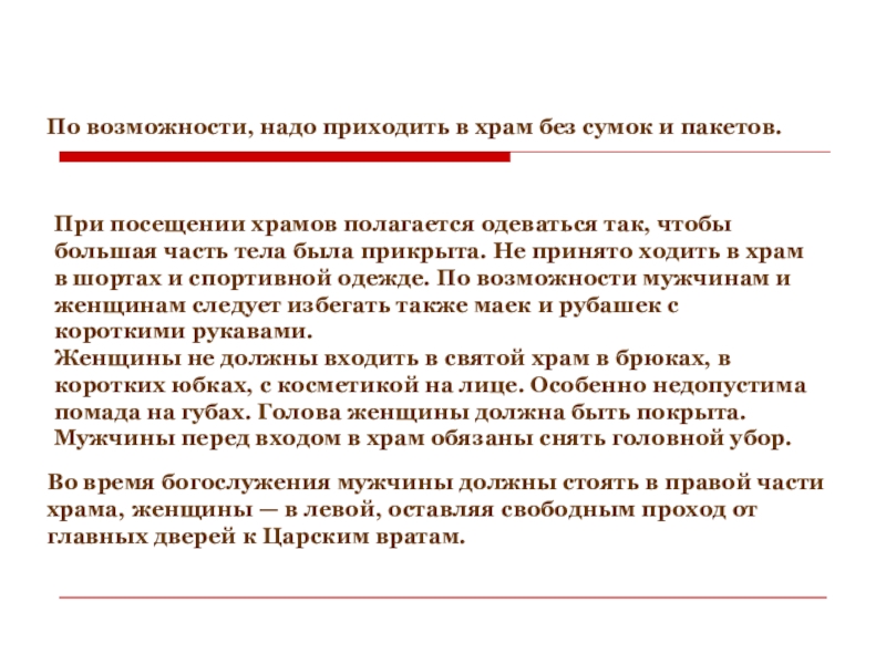 Женщины не должны входить в святой храм в брюках, в коротких юбках, с косметикой на лице. Особенно недопустима помада на губах. Голова женщины должна быть покрыта. Мужчины перед входом в храм обязаны снять головной убор.
